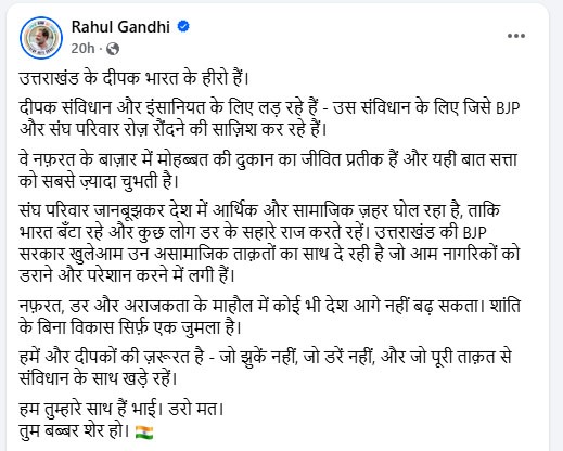 कोटद्वार। कोटद्वार बवाल तूल पकड़ता जा रहा है। अब इस मामले मे कांग्रेस सांसद और लोकसभा में विपक्ष के नेता राहुल गांधी ने एक्स पर ट्वीट कर मोहम्मद दीपक को हीरो बताया है। उन्होंने लिखा कि उत्तराखंड के दीपक भारत के हीरो हैं। दीपक संविधान और इंसानियत के लिए लड़ रहे हैं। उस संविधान के लिए जिसे बीजेपी और संघ परिवार रोज़ रौंदने की साजिश कर रहे हैं। वे नफरत के बाज़ार में मोहब्बत की दुकान का जीवित प्रतीक हैं और यही बात सत्ता को सबसे ज़्यादा चुभती है। संघ परिवार जानबूझकर देश में आर्थिक और सामाजिक ज़हर घोल रहा है, ताकि भारत बंटा रहे और कुछ लोग डर के सहारे राज करते रहें। उत्तराखंड की बीजेपी सरकार खुलेआम उन असामाजिक ताक़तों का साथ दे रही है जो आम नागरिकों को डराने और परेशान करने में लगी हैं। नफरत, डर और अराजकता के माहौल में कोई भी देश आगे नहीं बढ़ सकता। शांति के बिना विकास सिर्फ एक जुमला है। हमें और दीपकों की ज़रूरत है, जो झुकें नहीं, जो डरें नहीं, और जो पूरी ताकत से संविधान के साथ खड़े रहें। हम तुम्हारे साथ हैं भाई। डरो मत। तुम बब्बर शेर हो।